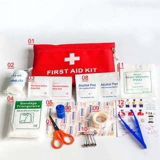 Next Day Delivery Available. First aid kits come in all types and the list of content vary depending on their use for example home first aid kits are used for treating minor injuries and travel first aid kits need to be more comprehensive. 30pc First Aid Kit - Carry pouch with front pocket.